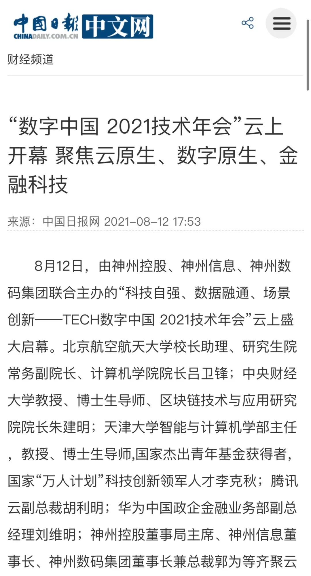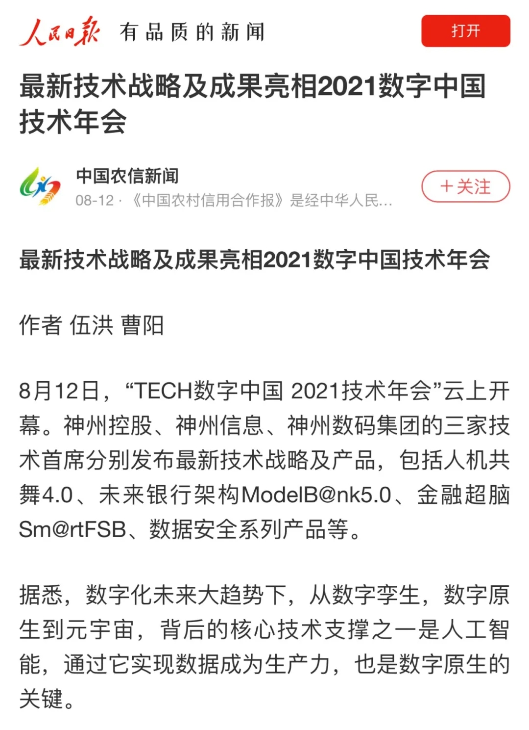 8月12日,由神州控股、神州信息、kaiyun.com集团联合主办的“科技自强、数据融通、场景创新——TECH数字中国 2021技术年会”云上盛大启幕,发布神州信创云、ModelB@nk5.0、金融超脑Sm@rtFSB、云原生数字化安全底座、园区智能体等重磅产品,国内各大权威、影响力媒体多角度多频次对盛况进行报道!