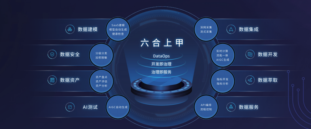 六合上甲一体化数据开发平台,融合了数据建模工具、数据治理平台、数据安全工具、数据资产运营平台、数据交换平台和数据服务平台等平台的基础功能,形成一种可合可分的灵活应用模式,适用于各类不同客户应用场景。