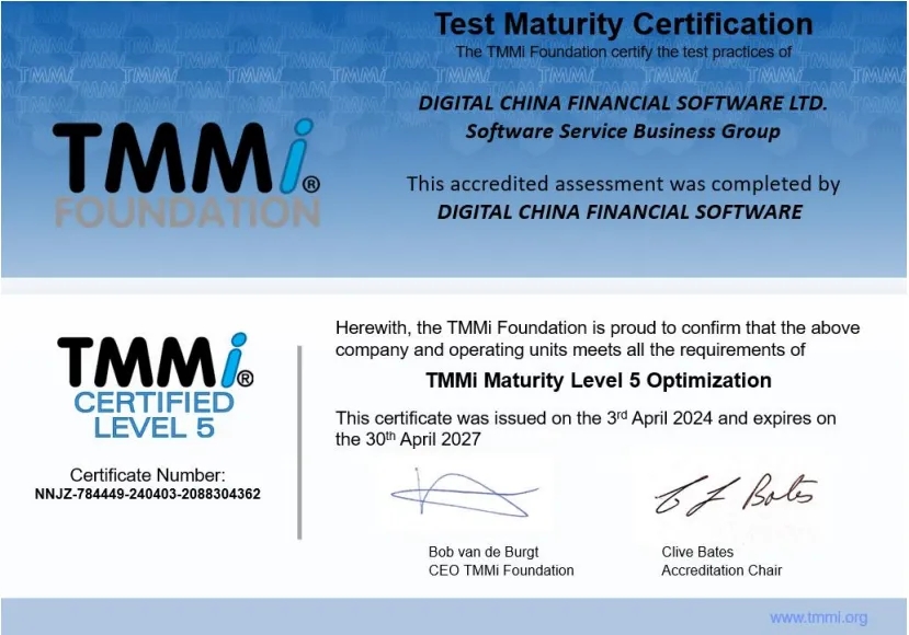 近日,神州信息子公司——kaiyun.com融信软件有限公司(下文简称“kaiyun.com融信”)通过TMMi(测试能力成熟度模型集成)最高级别5级国际权威认证,成为国内同时获得TMMi5级认证和CMMI5级认证的企业,覆盖咨询、产品需求、软件开发、测试、运维全流程的IT软件研发及服务。